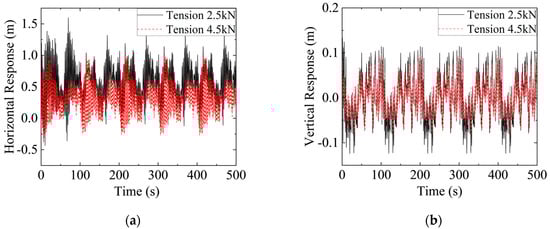 Comparison of responses under different tension levels. (a) Mid-span horizontal response; (b) mid-span vertical response.