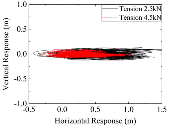 Figure 8 shows the phase trajectory distribution of the conductor’s centroid under different tension levels. It can be observed that, under low-tension conditions, the centroid trajectory presents a relatively regular elliptical distribution, indicating that the vibration is primarily influenced by a single dominant frequency. However, under high-tension conditions, the amplitude is significantly reduced, suggesting that higher tension effectively suppresses wind-induced vibrations. Additionally, the symmetry of the conductor’s motion trajectory is enhanced, and nonlinear vibration phenomena are reduced.