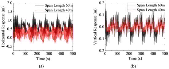Comparison of responses under different span lengths. (a) Mid-span horizontal response; (b) mid-span vertical response.
