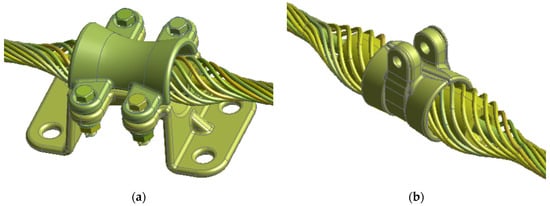 In railway power supply system design and stability analysis, the dynamic response of connecting fittings is crucial to ensuring system safety. To examine the mechanical behavior and impact of different connecting fittings under wind excitation, this study develops two representative fitting models, as shown in Figure 12a,b. The model in Figure 12a represents a conventional support-type fitting, which secures the conductor through a rigid connection. It exhibits high load-bearing capacity and structural stability, making it suitable for applications that require enhanced conductor fixation and displacement prevention. In contrast, the model in Figure 12b is an improved suspension-type fitting connection, primarily designed for flexible connections between auxiliary conductors and main conductors. This configuration helps attenuate vibration transmission and improves system stability. Each fitting type offers distinct advantages—the suspension-type fitting enhances conductor flexibility and operational safety, whereas the support-type fitting enhances overall structural stiffness and positioning precision.