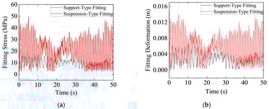Figure 13b further illustrates the deformation variation in the two fittings under wind excitation. It can be observed that the deformation of the suspension-type fitting fluctuates significantly, exhibiting strong periodic variation characteristics. This indicates lower stiffness under wind excitation, making it more susceptible to external excitations and resulting in greater structural deformation. Such excessive deformation may lead to fatigue accumulation at the connection points, thereby reducing the long-term stability of the system. Comparatively, the support-type fitting exhibits significantly smaller deformation fluctuations, suggesting that its optimized structural design provides higher wind resistance. It effectively distributes external loads, reduces wind-induced structural deformations, and enhances the reliability and service life of the fitting.