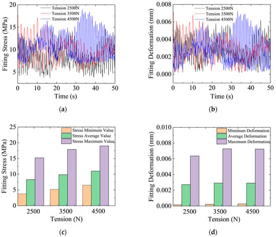 Wind-induced vibration response of support-type fitting under different tension levels. (a) Comparison of fitting stress; (b) comparison of fitting deformation; (c) comparison of fitting stress values; (d) comparison of fitting deformation values.