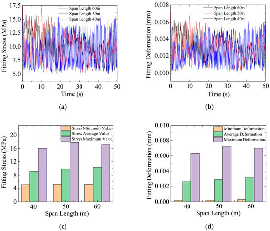 Wind-induced vibration response of support-type fitting under different span lengths. (a) Comparison of fitting stress; (b) comparison of fitting deformation; (c) comparison of fitting stress values; (d) comparison of fitting deformation values.