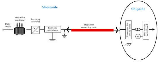 Figure 1 shows a schematic of the overall electrical system of an OPS consisting of ship-side electrical systems (onboard receiving device), cable management system, shore-side electrical systems, and infrastructure [39,40]. HVSC can be realized at 6.6 or 11 kV [36,41], and low-voltage shore connection (LVSC) is realized at 440~380 V (50/60 Hz) [42].