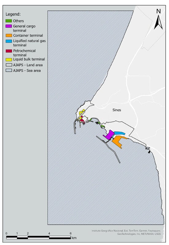The Port of Sines is a maritime infrastructure of vital importance for Portugal and other countries. The maritime area is 147.5 km2 (Figure 2), with a maximum depth of 28 m. Presently, this port has five specialized terminals, including a sports and fishing port, with private concessions, which are included in Table 2.