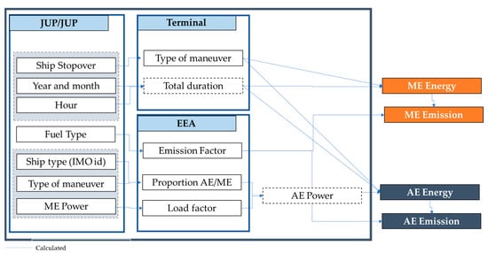 While ships are maneuvering within a port’s jurisdiction area, their main engines (MEs) operate at a lower load factor or are shut down. In this case, the auxiliary engines (AEs) mobilize the ship, where their load percentage varies depending on the type of maneuver. To maintain the functionality and safety of the ship during berthing, AEs provide the necessary power for critical systems. Depending on fuel type and technology, AEs can have even higher emission factors than MEs [20,21].