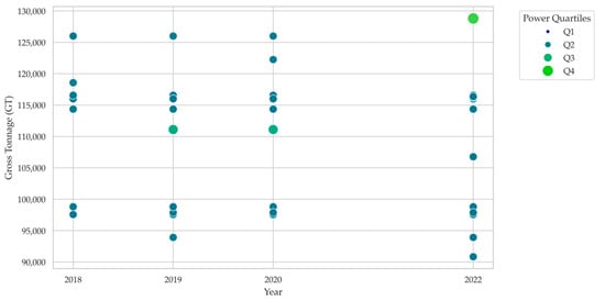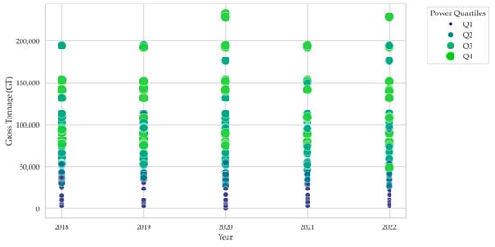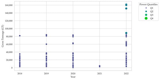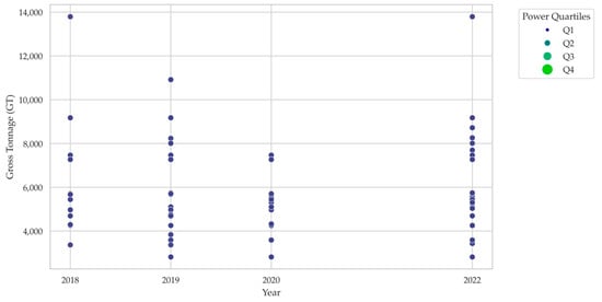 Figure 4, Figure 5, Figure 6 and Figure 7 show the bubble chart of the dwt and power of ME by terminal, for the period 2018–2022. The ME power was divided into quartiles as a statistical tool to facilitate comparison and analyze trends in GT by year for each terminal. Given the different types, densities, and quantities of cargo and ships, this representation allowed for characterizing the trends in cargo/ship handling across the various terminals. From this analysis, the following observations emerged: