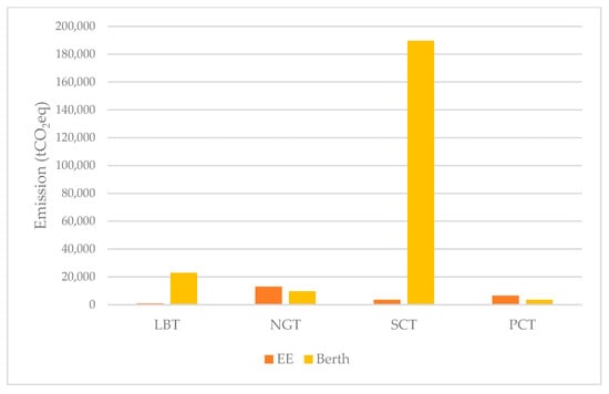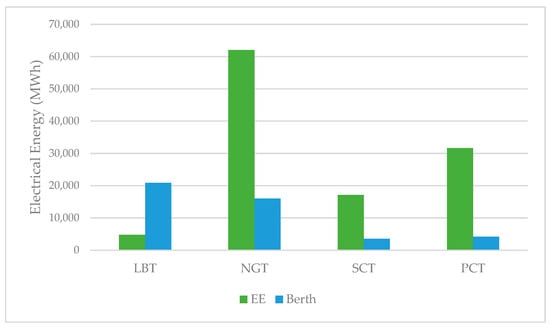 Figure 8 and Figure 9 show the average power consumption and emissions for each terminal. It is noteworthy that in the NGT, SCT, and PCT, the energy consumption per electrical energy (EE) was higher than the consumption of the AE in berthing operation. Additionally, these emissions were only surpassed by the emissions from the operation of the equipment in the LBT and SCT. The reason for this is multifaceted. One of the factors was that, in these terminals, there was an increase in per ship charge (Figure 4 and Figure 7), berthing time (Table 4), and emissions (Table 5).