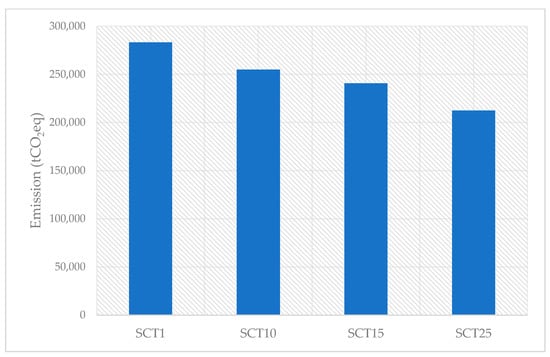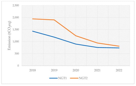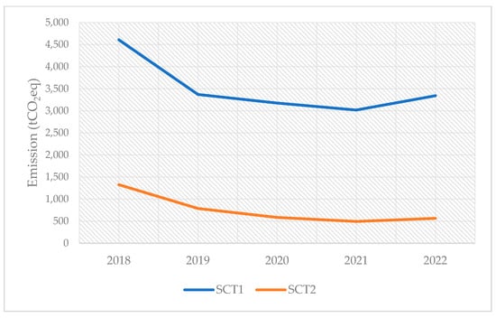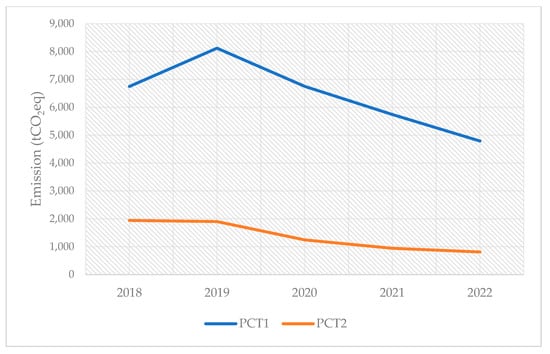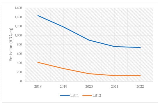 To calculate the electrical energy consumption of the terminals’ equipment, the measurements of the electrical supply of the network were considered. Monthly records measured at the transformation points (TPs) in the LBT and SCT, managed by port authorities, were used. Additionally, the concessionaires that manage the NGT and PCT provided their energy consumption records for the same period. Emissions were calculated according to Equation (1), where the grid emission factors used are those indicated for each year by the APA [65]. Since 2005, the APA has been publishing annual emission factors used to calculate the emissions associated with Portugal’s energy consumption. These factors are based on measurements and real data and consider the impact of renewable energy penetration. Their purpose is to establish or plan measures to reduce emissions (Lopes, 2023) [66]. These factors were used to estimate emissions from electricity consumption across all terminals.