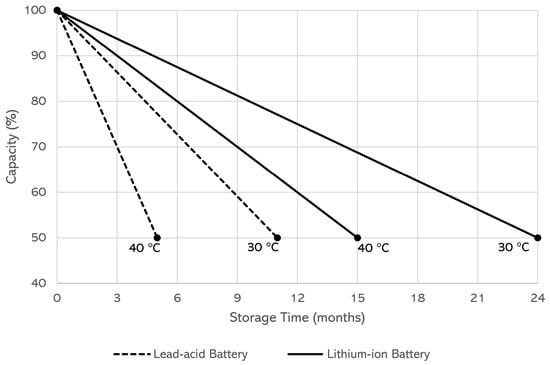 67]. In lithium-ion batteries at 40 °C, the battery capacity dropped to 50% after 15 months. At a lower temperature (30 °C), the battery took at least 2 years to reach 50% self-discharge. Moreover, a battery can have a self-discharge rate of almost 4 years when stored at a room temperature of 20 °C. Lead-acid battery capacity is more sensitive to high temperatures [