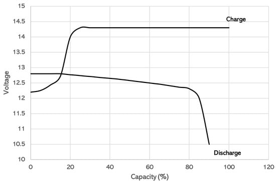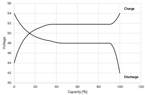 67]. There was stability in the voltage in the range of 30–90% of the battery capacity. A rapid increase in the voltage at the end of charging when reaching 90% capacity and a similar one during discharging at the same percentage, but with a voltage drop, was also observed. Such an increase and decrease in the battery voltage is a disadvantage of the lithium-ion battery and should be considered in order to prevent battery damage and maximize battery life.