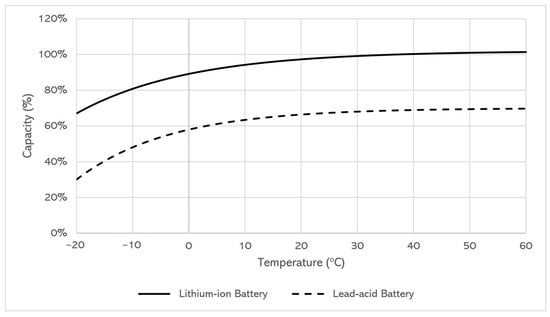 Thus, temperature can affect both battery types, though at different rates. At high temperatures, lithium-ion batteries retained higher capacity levels and reached 100% at 20 °C with a 0.5 C discharge rate, compared with lead-acid batteries that cannot reach 100% until the discharge rate is reduced to 0.05 C.