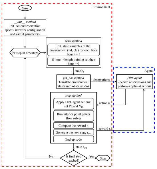 Additionally, it leverages the Pandapower library for modeling and solving power system-related aspects such as running the PF and building the network. The specific flowchart of the OpenAI Gym-based custom environment and its interaction with the RL agent is summarized in Figure 2.