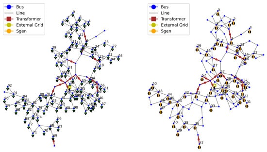 In this initial case, the OPF was executed for the original network without RES. The cost function considered is polynomial, using the default network coefficients , , and for each generator. The Pandapower interior-point method (IPM) solver was employed as a comparative method.