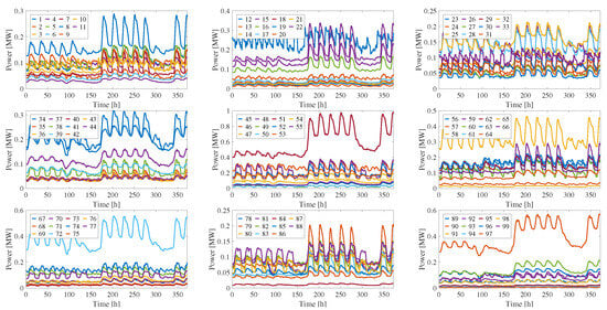 The load profiles used for the training and the evaluation of the agent were extracted from a data collection presented in [29]. It contains a one-year data repository of hourly electrical load profiles from 424 French industrial and tertiary sectors. The dataset contains 18 electricity load profiles derived from hourly consumption time series collected continuously over one year from a total of 55,730 customers. All data was appropriately scaled to ensure compatibility with the network under analysis. Since the test system includes 99 different loads, a corresponding number of distinct load profiles was required. To address this, 99 new profiles were generated through suitable linear combinations of the original 18, allowing the creation of realistic yet differentiated load behaviors for each network load. This process was repeated twice to obtain two distinct sets of data, one for training and one for evaluation. In Figure 4, the 99 load profiles used for training (generated using a seed value of 42) are shown. The profiles used for the evaluation were generated similarly using a different seed value of 2. In both cases, the seed was used to generate multiple load profiles from the existing ones. This was necessary due to the limited availability of only 18 real profiles, whose role was limited to serving as building blocks in the generation of the complete set of 99 distinct profiles required for the simulation.