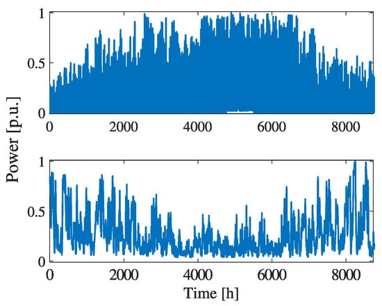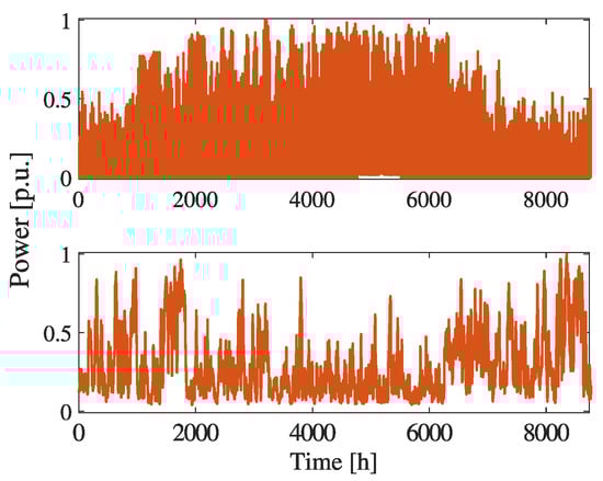To test the algorithm under conditions of uncertainty, renewable energy generators with a peak power of 200 for photovoltaic and a 300 for wind were installed randomly in the network. res generators are modeled as PQ-buses in the PF calculation. The hourly trends of their production profiles were those collected in France during 2018 (for training) and 2019 (for evaluation) and are available on the ENTSO-E website [30]. The profiles are depicted in Figure 5 and Figure 6.
