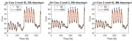 The second case is similar to the previous one, with the addition of some non-dispatchable renewable generators, such as solar and wind. The cost of these generators is set to zero, assuming that the network under investigation prioritizes the dispatch of RESs. Therefore, it is assumed that at each hour, all power generated by non-programmable sources is absorbed by the loads. What can be modified is solely the production profile of the other 53 programmable generators. Since the cost function remains unchanged compared to case 1, the IPM solver is still used as a comparative method. In Figure 7 the cost values obtained with the algorithms are shown. In Figure 7c it is evident how the number of timesteps used for the training impacts the accuracy of the RL algorithm.