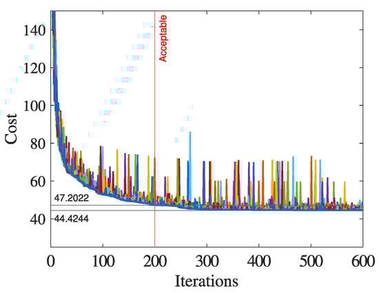 This case takes into account the valve point effect in generators. Therefore, in this scenario, the comparative method used is the genetic algorithm (GA). Initially, particle swarm optimization (PSO) was used as a comparison method. This choice was made because such algorithms typically guarantee convergence for very large action spaces within relatively short time-frames. However, given the size of the network, the PSO in our tests was never able to achieve cost values comparable to those obtained with RL. For this reason, the slower but more robust GA-based method was used. In Figure 8, it is evident that taking the first set of loads (hour 1) as an example, the algorithm can reach the minimum point in about 600 iterations. The time required for this simulation is approximately 30 min. However, a satisfactory result can be achieved in just 200 iterations, corresponding to about 8 min of simulation. Independently on the number of iterations, the population size was set to 50. Even considering only 200 iterations, the total simulation time exceeds two months. Therefore, we decided to simulate only the first 20 h. This is a time interval sufficient to allow a comparison with the RL. In all simulations where the valve point effect was considered and were set to 200 and 0.2 respectively.