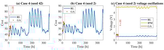 This scenario represents the implementation of soft voltage constraints, as described by the cost function . In this cost function, the primary goal is to minimize voltage fluctuations at each bus, ensuring they stay close to their nominal values (set to 1 p.u.), while also minimizing the overall cost function. The soft constraint introduces a penalty in the cost function to discourage the generation profiles that cause significant voltage deviations from the nominal value (1 p.u.) at the network buses. The GA is used as the method of comparison. The results concerning the first 350 h are summarized in Figure 9 (GA time refers only to the first 20 h because due the computational time the entire simulation would last more than 2 months). More specifically, Figure 9c highlights the sum of voltage deviations from the nominal value across all nodes of the network, computed on an hourly basis. This sum represent the portion of the cost function relate to the soft constraints, and we use it to analyzed the influence of the minimization of this contribution in the three algorithms compared. It is observed that the inclusion of voltage constaints results in a reduction of about 1/5 compared to the case without voltage control(IPM), and nearly a 20% reduction when compared to the results obtained using the ga with voltage control.