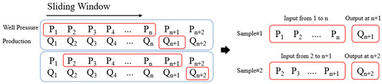 Oil well production forecasting is inherently a multi-step forecasting problem. Before constructing the training dataset, continuous time series data must be partitioned into input–output sample pairs using a sliding window. The raw time series data contains N time steps, each with 2 features (daily well pressure and production rate), which can be represented as follows: