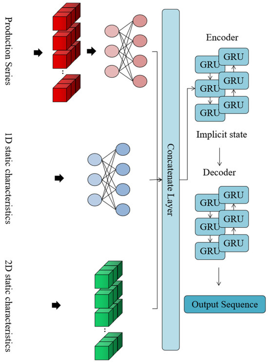 Existing dynamic production prediction models face two primary limitations. First, relying on historical production data to predict future trends biases models toward learning intrinsic patterns within production sequences while neglecting the influence of other features, such as wellhead pressure [7,8]. In reality, wellhead pressure sequences contain richer information, and predicting production sequences from pressure data aligns more closely with the logic of mechanistic models [9,10]. Second, current models often lack comprehensive input features, being typically limited to one-dimensional static and temporal attributes, which hinders the establishment of robust production mapping relationships [11,12]. To address these issues, a CNN-BiGRU productivity prediction model is proposed. To accommodate multidimensional feature inputs, three independent input layers are designed: a fully connected neural network layer for extracting one-dimensional static features, and convolutional network layers for capturing two-dimensional static features and temporal pressure characteristics. Additionally, a seq2seq (encoder–decoder) structure is introduced to establish mapping relationships between these features and production sequences, enabling the model to handle cross-sequence learning tasks (e.g., the use of wellhead pressure sequences to production sequences) [13,14]. The impact of model parameters on performance is analyzed, and the model’s effectiveness and practicality are validated using a shale oil field case study.