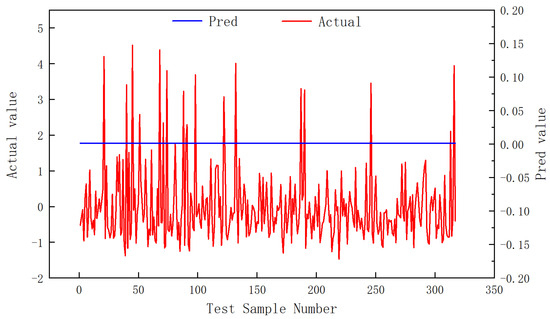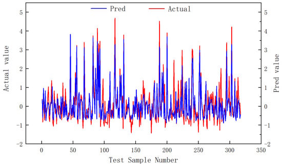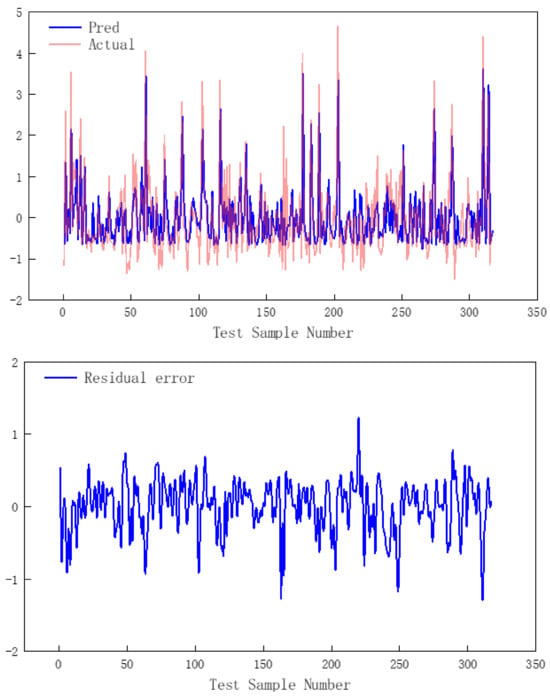 The model’s test set predictions under optimized hyperparameters are visualized in Figure 14. While sparse outliers exist, the model achieves strong concordance with the majority of samples clustered within the (−1, 1) normalized range. The test set MSE of 0.46 confirms that there was effective generalization without evidence of overfitting. Furthermore, the prediction residuals demonstrate approximately uniform distribution along the zero mean baseline (mean residual = 0.004), quantitatively validating the model’s systematic alignment between predicted and observed production values.