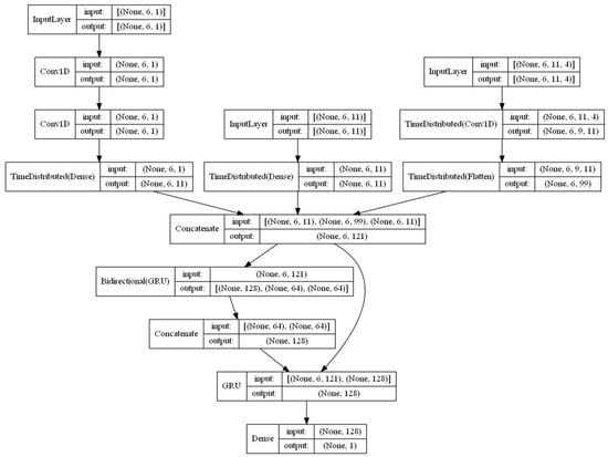 While conventional machine learning models used for production forecasting are constrained to homogeneous input architectures—typically limited to production sequence data coupled with one-dimensional static parameters through shared embedding layers—this approach fails to capture the multidimensional nature of reservoir characterization. Our CNN-BiGRU architecture addresses this critical limitation through tripartite input layer design (Figure 4), enabling the simultaneous processing of the following:
