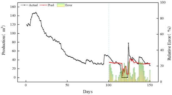 Well A1 features a 1800 m horizontal section with reservoir permeability of 0.077 mD and 303-stage fracturing clusters. During the initial 100 production days, daily oil production exhibited a decline from 98 m3 to 40 m3. To optimize the production strategy, we configured the sliding window to 100 days and forecast horizon to 50 days based on the well’s petrophysical profile. The model’s 50-day production forecast (Figure 15) demonstrates strong concordance with actual decline trends, achieving a mean relative error (MRE) of 16.11% between predicted and measured production rates.