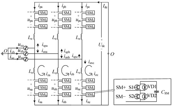 Figure 1 illustrates the schematic of a three-phase MMC-UPFC. Each phase arm comprises N SMs adopting a half-bridge configuration, where S1 and S2 represent the switching devices, and CSM denotes the submodule capacitance. Lo represents the arm filter inductor.