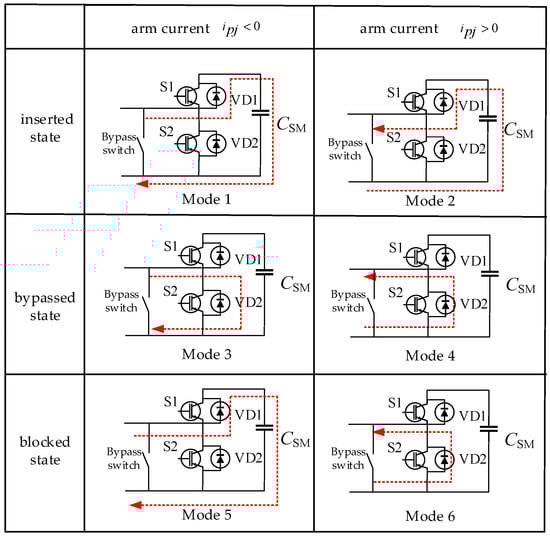 Figure 2 illustrates the operating state diagram of SMs in an MMC-UPFC. SM operational states are categorized into three types: inserted, bypassed, and blocked. In the inserted state, the operation is divided into Mode 1 and Mode 2 based on whether the arm current Ipj is positive (ipj > 0) or negative. In the bypassed state, switching device T1 remains off while T2 is on, with its operation (Modes 3 and 4) exhibiting an inverse switching configuration compared to the inserted state. For the blocked state, both T1 and T2 are turned off, and SM behavior is entirely dictated by the direction of the arm current, resulting in Modes 5 and 6. The current flow directions for all modes are explicitly indicated in Figure 2.