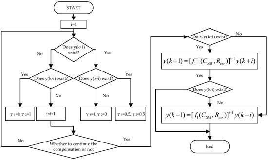 In the equation, k represents the position of the i-th missing data in Ym within the original dataset Y. y(k + 1) and y(k − 1) denote the data at positions k + 1 and k − 1 in Y, respectively; and γ1 and γ2 are determined by the time scale and the information status of data at the missing position, where the formula is provided by the state of Equation (13) in Section 2.2. The determination method is illustrated in the Figure 4 below.
