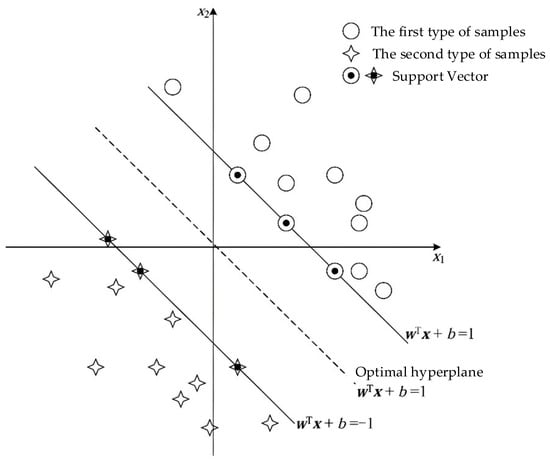 In the equation, w and b represent the weight vector and the optimal hyperplane offset, respectively. The optimal hyperplane is shown in Figure 5 below.