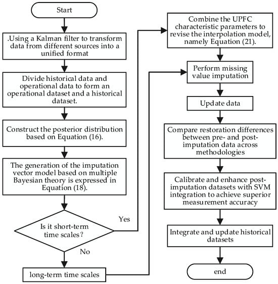 To address the aforementioned issues, this study proposes a hierarchical repair framework based on Bayesian multiple imputation and a Support Vector Machine, which aims to construct an adaptive imputation matrix by establishing a dynamic probabilistic model to analyze the multidimensional operational parameter distribution characteristics of UPFC equipment. While maintaining temporal correlation of data, the framework effectively overcomes the error accumulation problem inherent in traditional methods for power electronic device data repair. Innovatively employing a feature space mapping mechanism, the framework incorporates both the capacitor voltage fluctuation characteristics of UPFC submodules and the switching states of power electronic devices as imputation constraints. This approach achieves enhanced reconstruction accuracy for missing values while maintaining low computational complexity through dimensionality reduction operations, ultimately providing an engineering-practical data preprocessing solution for reliability analysis in flexible AC transmission systems., with core contributions including adaptive data preprocessing through modified Kalman filtering for dynamically adjusting noise covariance matrices to enhance data quality in high-noise scenarios; implementation of multiscale Bayesian multiple imputation that innovatively incorporates discrete-time equations derived from UPFC submodule state–space modeling into posterior distributions and missing value estimation processes, integrating historical data with real-time observations to generate multiple imputation sets while achieving coordinated imputation for transient and sustained missing data through posterior optimization; and nonlinear SVM calibration employing RBF kernels to map high-dimensional feature spaces, utilizing soft-margin optimization to eliminate outliers in imputation results and reinforce physical consistency in restored data. However, it should be noted that the Bayesian multiple imputation method still heavily relies on the completeness and representativeness of the dataset. Specifically, the imputation model constructed in this study imposes strict accuracy constraints on the measured parameters of the MMC-UPFC topology (including submodule capacitance values and arm inductance), where parameter deviations exceeding ±2% will lead to a significant expansion of the confidence intervals in the imputation results.
