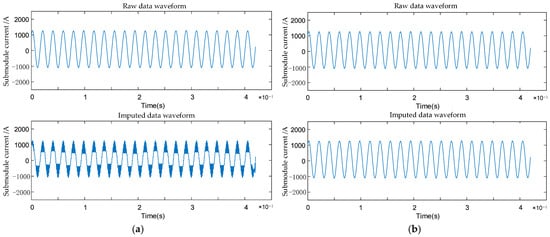 The interpolation results for AC-side single-phase current ipa are shown in (a) using linear interpolation and in (b) employing Bayesian multiple imputation.