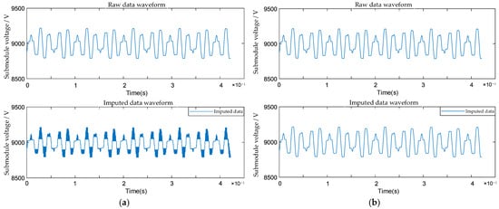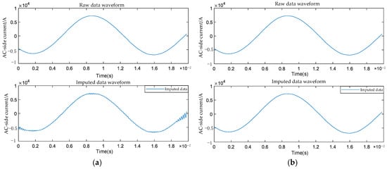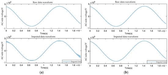 The interpolation results for AC-side single-phase voltage usc are shown in (a) using linear interpolation and in (b) employing Bayesian multiple imputation.