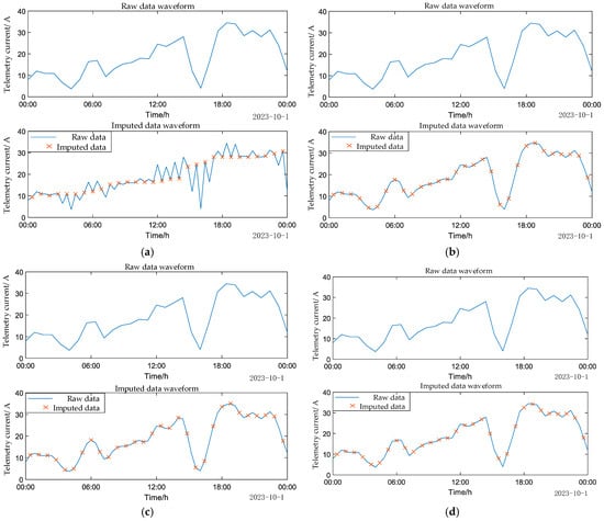 The interpolation results for telemetry current iSM are presented in (a) using linear interpolation, in (b) with the built-in Makima interpolation, in (c) with the cubic spline interpolation, and (d) through Bayesian multiple imputation.