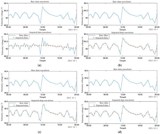 The interpolation results for telemetry voltage uSM are presented in (a) using linear interpolation, in (b) with the built-in Makima interpolation, in (c) with the cubic spline interpolation, and (d) through Bayesian multiple imputation.