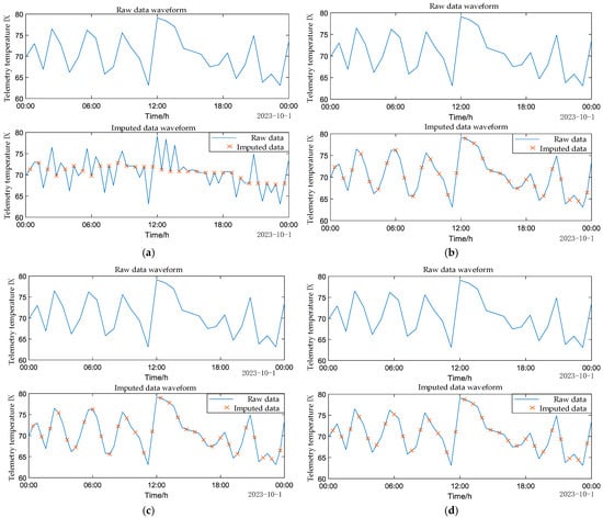 The interpolation results for telemetry temperature TSM are presented in (a) using linear interpolation, in (b) with the built-in Makima interpolation, in (c) with the cubic spline interpolation, and (d) through Bayesian multiple imputation.