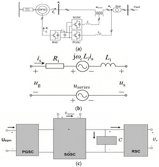 DFIG topology with SGSC and equivalent circuit. (a) DFIG topology with SGSC. (b) Equivalent circuit of the series grid-side converter in the synchronously rotating reference frame. (c) Equivalent circuit of the dc-link.