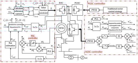 To maintain generator voltage and ensure DFIG connectivity during voltage dips, coordinated control of the RSC and SGSC is employed for effective voltage dip mitigation. The new control strategy proposed here comes from the perspective of limiting the transient DC component and the negative sequence power frequency component. To manage the operation of the RSC and the SGSC in the DFIG configuration, a control strategy is formulated that incorporates model predictive current regulation in conjunction with a T/4 delay-based separation technique for decomposing the voltage into its symmetrical positive and negative sequence components. In the following, it is verified that the use of MPCC during the fault can effectively suppress the overcurrent and reduce the DC bus voltage amplitude, so that the effectiveness of the GSC can be guaranteed to achieve power support. Furthermore, it is demonstrated that separating the positive and negative sequences enables smooth SGSC control in steady-state conditions. The study indicates that this work enhances the LVRT capability of the DFIG system, improving the adaptability of grid-integrated doubly fed wind turbines to grid disturbances.