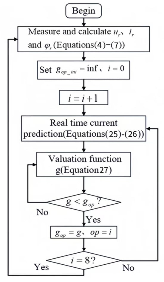 Ultimately, to realize current regulation, the switching vector that yields the minimum value of the cost function is determined and applied as the control output. The specific implementation structure of the MPCC strategy for the (RSC) is illustrated in the control block diagram presented in Figure 2, while the corresponding procedural steps are outlined in the flowchart depicted in Figure 3.