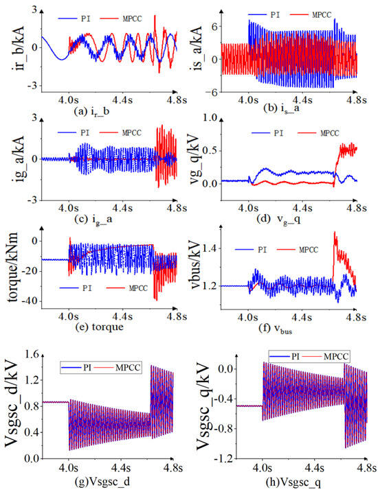 Figure 5a and Figure 6 show that the quality of the rotor current curve is stable if no fault occurs before 4 s. After the fault occurs, The rotor generates a starting current due to the negative-sequence component in the stator flux. Conventional PI control increases the rotor current to a peak of 2.1 kA at 0.076 s after a single-phase fault, and to a peak of 1.9 kA at 0.049 s after a two-phase fault. This means that under asymmetric faults, conventional PI control increases the rotor current to twice the steady-state value. However, under the improved collaborative control using MPCC, the maximum rotor current in Figure 5 and Figure 6 is around 1.1 kA. After 0.383 s of two-phase fault, the rotor current gradually decays after reaching the peak value of 1.14 kA. In the later stage of fault, it is basically between −0.89 and 0.76 kA, and compared with the fluctuation range before fault −1.0 to 1.0 kA, the exceeding limit does not exceed 24%.