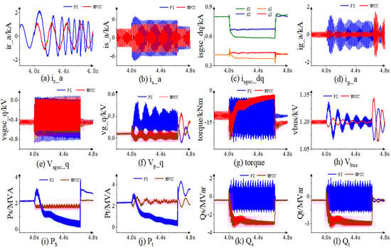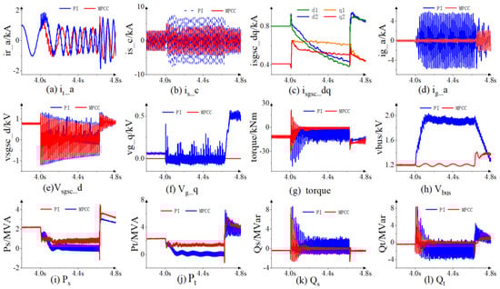 At the moment of fault detection, the excitation converter detects a voltage dip at the grid connection point. The system switches the RSC from the original PI control to a model predictive current control strategy. The PGSC adopts a traditional PI control strategy, while the SGSC employs positive–negative sequence separation control during asymmetric faults and PI control during symmetric conditions. Figure 4 illustrates the simulated waveform when the system voltage drops to 60% for a three-phase symmetrical fault, Figure 5 illustrates the simulated waveform when the system voltage drops to 60% for a single-phase ground fault, Figure 6 displays the waveform for a 70% voltage drop during a two-phase short circuit. Panels 4 (a–e) depict rotor/stator currents, grid currents/voltages, torque, and DC bus voltage in the dq frame. Figure 5 and Figure 6a–l cover key system responses, including phase-a currents, SGSC voltage/current components, grid-side current, torque, DC voltage, active power, and reactive power flow. In addition, the PI marked in the Figure represents the conventional PI control (RSC adopts the directional control based on the stator flux linkage, and SGSC adopts the T/4 positive and negative sequence voltage separation control). The MPCC represents the use of improved coordinated control (RSC uses MPCC, SGSC still uses positive and negative sequence separation control). Specifically, in Figure 4, due to a symmetrical fault, the voltage is only positive sequence. Therefore, SGSC adopts PI control instead of the T/4 delay positive and negative sequence component control.