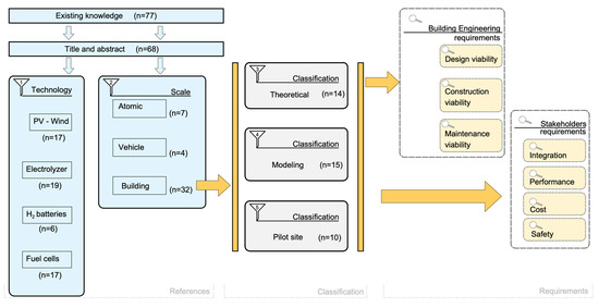 Figure 2 presents a workflow diagram of the literature review that has been classified. On the left side, the outcomes of the scientific literature are illustrated, with a list of general groupings in blue, followed by an initial classification in grey of the articles that have installed H2 systems in buildings. On the right side, in orange, are the subsequent defined requirements—building engineering requirements and stakeholder needs—categorized into design viability, construction viability, and maintenance viability on one side and integration, performance, cost, and safety on the other. The scientific literature will define the matrix of variables.