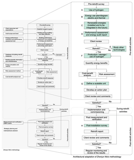 After analyzing existing knowledge, the need for a precise sequence of steps is deduced as a recommended guide to follow in the process. Therefore, given the diversity of data and insights into the status and procedures for incorporating H2 into projects and daily practices, it is essential to refer to Zhenjun Ma’s methodology [10]. Zhenjun Ma’s work, which provides a multi-criteria guide for comparison and classification in retrofitting processes, can be adapted to this context through architectural adaptation. This adaptation contributes to the structured approach to integrating H2 systems. The main change during the methodology’s interpretation is modifying the base goal. The methodology changes from an open hypothesis to a determinate one: integrating an H2 system into buildings. These changes are graphed in green, emphasizing the importance of first steps.