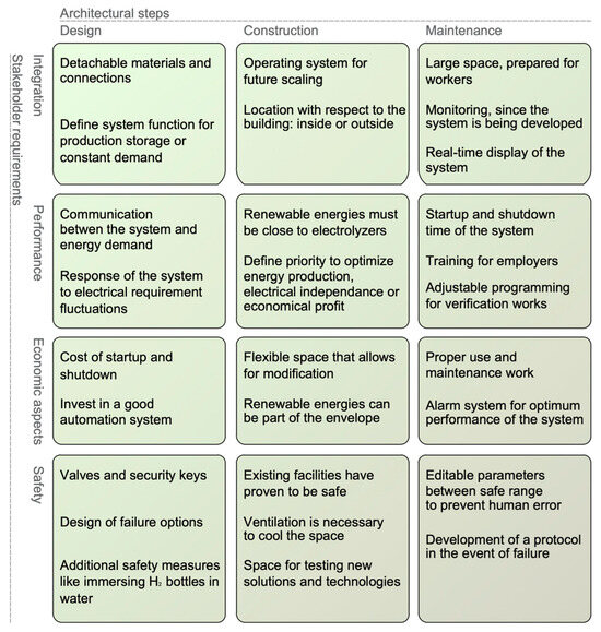 Integrating stakeholder requirements and architectural processes allows for the grouping and organization of information. Furthermore, by refining the results under the criteria of the research team, which is in constant contact with companies and manufacturers [26], the first variable matrix is developed, which is, to our knowledge, a reference for the integration of H2 systems into buildings; see Figure 5. Thus, the table serves as a promising tool for integrating H2 into buildings and disseminating the needs and considerations to be addressed according to the requirements of each particular case.