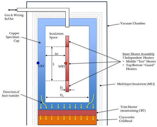 The high-level configuration of the GHC test article is presented in Figure 1 (vacuum chamber not shown), and it situates a cylindrical heater rod assembly inside a copper specimen cup that is bolted to and cooled by the cryocooler cold head. The heater assembly is oriented vertically and is concentric to the cup. This layout results in a cylindrical test specimen with a small axial through-hole, and it places the CBT on the outside surface area, with the WBT on the inner surface of the hole. A trim heater is employed between the cup and cold head to maintain the CBT.