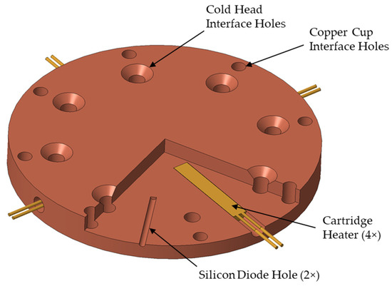 The trim heater design is shown in Figure 2 and consists of a 12.7 mm thick, 120.65 mm diameter copper disc with four 6.35 mm diameter, 70 W, 120 VAC cartridge heaters spaced 90° apart. Two 2.4 mm diameter holes spaced 180° apart are also included to accommodate silicon diode temperature sensors. In the orientation shown, the bottom-facing side interfaces with the thermal shim and cold head via eight M6 × 1.0 flat-head stainless steel fasteners, and the top-facing side interfaces with the copper cup via eight stainless steel 12–24 thread socket-head cap screws. In the final assembly, the heaters and silicon diodes are permanently anchored in-place using Stycast 2850FT epoxy. Additionally, the four heaters are wired in parallel, giving the unit up to 280 W at full power.