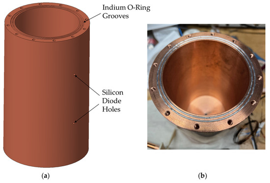 (a) CAD model of the copper specimen cup; (b) indium o-rings installed.