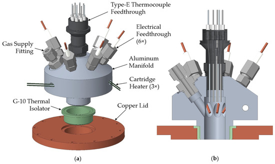 The layout of the lid and feedthrough assembly had to accommodate six heater power wires, six thermocouple wires, and a gas supply interface while remaining vacuum-leak-tight across a wide temperature range. The situation was made even more challenging due to the vertical space constraint inside the vacuum chamber. The final design is shown in Figure 4 and consists of a stepped copper lid, 14.3 mm at the thickest part and 9.53 mm at the thinnest, with a 1-1/2″–12 tapped hole in the middle; a G-10 isolator that threads into the lid, sized to provide a thermal break distance of 3.18 mm between the aluminum manifold and lid, with a 1-1/4″–18 threaded hole in the middle; and a cone-shaped aluminum manifold that threads into the G-10 isolator and houses three 20 W, 120 VAC cartridge heaters, six individual electrical feedthroughs for the inner heater assembly, a five-channel thermocouple feedthrough, and a gas supply fitting. Employing a conical shape angled the electrical feedthroughs enough to clear the top of the vacuum chamber and allowed the terminals to converge on the 22.2 mm diameter center port in the aluminum manifold. A 6 mm gap between the manifold and lid allowed for a round MLI blanket to be installed, limiting the radiative heat transfer between the two components during testing.